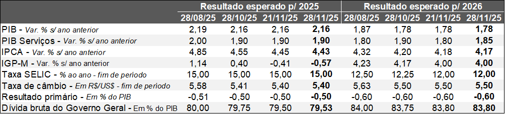 Fonte: Banco Central do Brasil / Relatório FOCUS (28/11/2025). *Mediana. Elaboração: AE/CDL POA.