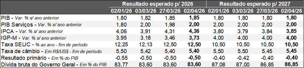 Por sua vez, a produção industrial em fevereiro subiu +0,9% contra janeiro, na série com correção sazonal, com avanços disseminados. Logo, a estatística ultrapassou a mediana entre as previsões dos especialistas sondados pelo Broadcast+ (+0,7%). A tendência é de uma expansão significativa no 1ºT/26, não só da manufatura como da economia como um todo (cerca de +1,0%), fruto da base de comparação deprimida e das consequências dos incentivos à demanda do governo federal, como a ampliação do enquadramento para isenção do Imposto de Renda Pessoa Física. Todavia, o panorama para o restante do ano é desafiador por causa das incertezas comerciais, da geopolítica e das eleições, de modo que o resultado para o PIB no agregado em 2026 permaneceu em +1,85%.
