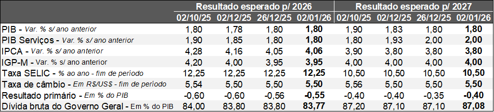 O prognóstico dos agentes para o PIB de 2026 permaneceu em +1,80% entre os dias 26 de dezembro e 02 de janeiro. Cabe, portanto, elencar os motivos que devem levar o crescimento a perder fôlego em comparação com 2025 (cerca de +2,3%). Em primeiro lugar, o PIB mundial deve subir um pouco menos em 2026 (+3,1%) em relação a 2025 (+3,2%), de acordo com o FMI. Em segundo, o Brasil não contará com o impulso da agropecuária, proveniente da supersafra de grãos de 2025 (346 milhões de toneladas). Em terceiro, por mais que as expectativas apontem para a queda da Taxa SELIC ao longo do presente ano, é importante lembrar que o efeito da política monetária sobre o nível de atividade é defasado em alguns trimestres até sua plena materialização. Por fim, a ociosidade é muito pequena, principalmente no mercado de trabalho, de modo que a incorporação de pessoal é cada vez mais difícil por diversas razões, incluindo as transformações demográficas (encolhimento da quantidade de entrantes e envelhecimento) e o peso das transferências de renda governamentais, como o Bolsa Família, os Benefícios de Prestação Continuada (BPC) e os programas estaduais e municipais.