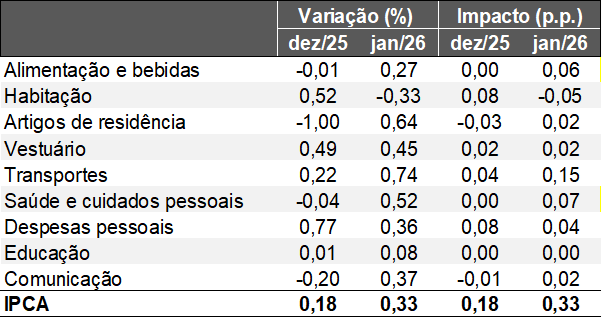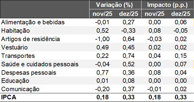 1) Estatística mensal em linha com o esperado: em dezembro, o IPCA subiu 0,33%, conforme a mediana das projeções dos especialistas sondados pelo Broadcast+.