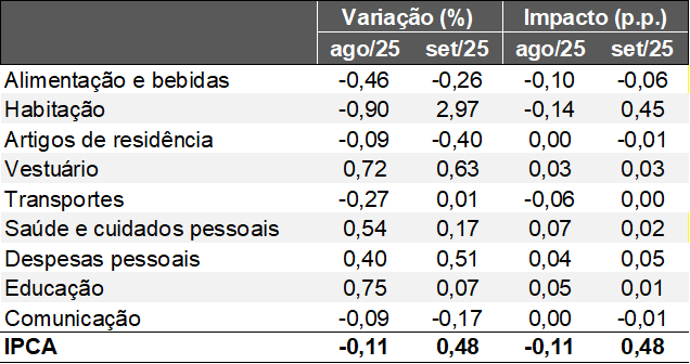 O índice cheio ficou acima da mediana para o respectivo período entre 1999 e 2025 (+0,34%). Parcela significativa da explicação diz respeito ao impacto da distribuição do Bônus de Itaipu em agosto aos consumidores, responsável pela redução pontual da eletricidade residencial (-4,21%). Como se tratou de um declínio temporário, a tarifa retornou ao padrão normal (+10,31%), exercendo contribuição de +0,41 ponto percentual.