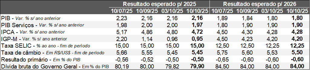 Não tivemos mudanças significativas nas previsões dos principais indicadores entre os dias 03 e 10 de outubro. A única alteração relevante ocorreu no âmbito do IPCA aguardado para 2025 (de 4,80% para 4,72%), na esteira da divulgação da leitura oficial de setembro. De acordo com o IBGE, o índice subiu 0,48%, enquanto o consenso entre os prognósticos dos agentes sondados pela Reuters acusava +0,52%. Ademais, os recortes sensíveis aos movimentos da produção e do emprego, como os serviços subjacentes e aqueles intensivos em trabalho, vieram abaixo do computado pela XP.