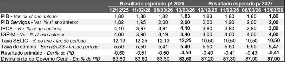 O IPCA de fevereiro avançou +0,70%, ou seja, acima do consenso entre os analistas sondados pelo Broadcast+ (+0,63%). Cabe ressaltar que a magnitude dos números do mês é impactada por questões sazonais, como, por exemplo, a contabilização única dos reajustes da educação (5,21%). Todavia, parcela importante da diferença foi determinada pela alimentação no domicílio (+0,23%), enquanto os especialistas aguardavam +0,07%. Por sua vez, os chamados recortes qualitativos – obtidos por meio da exclusão de componentes voláteis e, por conseguinte, mais sensíveis aos ciclos econômicos – apresentaram deterioração considerando as métricas de tendência de curto prazo. O resultado, aliado às repercussões do enfrentamento no Irã, fez com que a previsão para 2026 saísse de 3,91% para 4,10% (recorde desde 11 de dezembro de 2025). O contexto supracitado também alterou os prognósticos envolvendo a política monetária, de modo que a visão predominante a respeito da Taxa SELIC na reunião do COPOM dessa semana passou de uma diminuição de 0,50 para 0,25 ponto percentual, algo que acabou se confirmando. Ademais, a estimativa para o término de 2026 moveu-se de 12,13% para 12,25% ao ano.