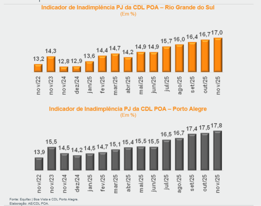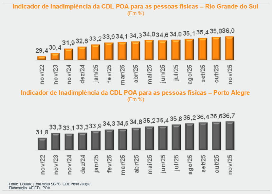 O Indicador de Inadimplência da CDL Porto Alegre, elaborado pelo Núcleo Econômico a partir da base de dados da Equifax | Boa Vista, registrou novas máximas históricas em novembro de 2025. Entre as pessoas físicas, o índice alcançou 35,96% no Rio Grande do Sul e 36,72% em Porto Alegre, renovando os maiores níveis desde o início da série histórica em fevereiro de 2022. Em relação a outubro, as taxas avançaram 0,17 e 0,13 ponto percentual, respectivamente. As estimativas equivalem a 3,084 milhões de CPFs negativados no Estado, sendo 394.726 na Capital.