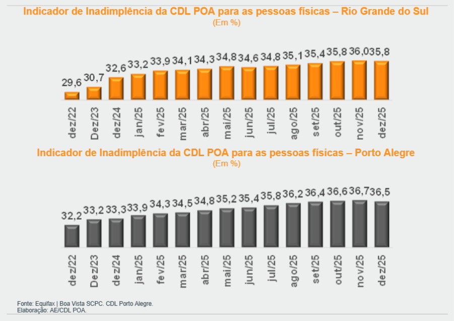 O Indicador de Inadimplência da CDL Porto Alegre, calculado a partir da base Equifax | Boa Vista, mostra que a quantidade de gaúchos adultos com dívidas em atraso permaneceu elevada no encerramento de 2025, apesar de um leve respiro. Em dezembro, 35,84% dos adultos no Rio Grande do Sul apresentavam restrição ao crédito, enquanto em Porto Alegre o índice alcançou 36,47%. Na prática, isso significa 3,074 milhões de consumidores negativados no Estado e 392.058 na Capital, conforme estimativas próprias baseadas no Censo 2022. Trata-se da primeira queda desde junho de 2025 e apenas a segunda desde junho de 2024 no RS, de modo que os números seguem bastante próximos dos recordes observados nos meses anteriores. No RS, a redução foi de 0,12 ponto percentual frente a novembro; na Capital, de 0,25 ponto.