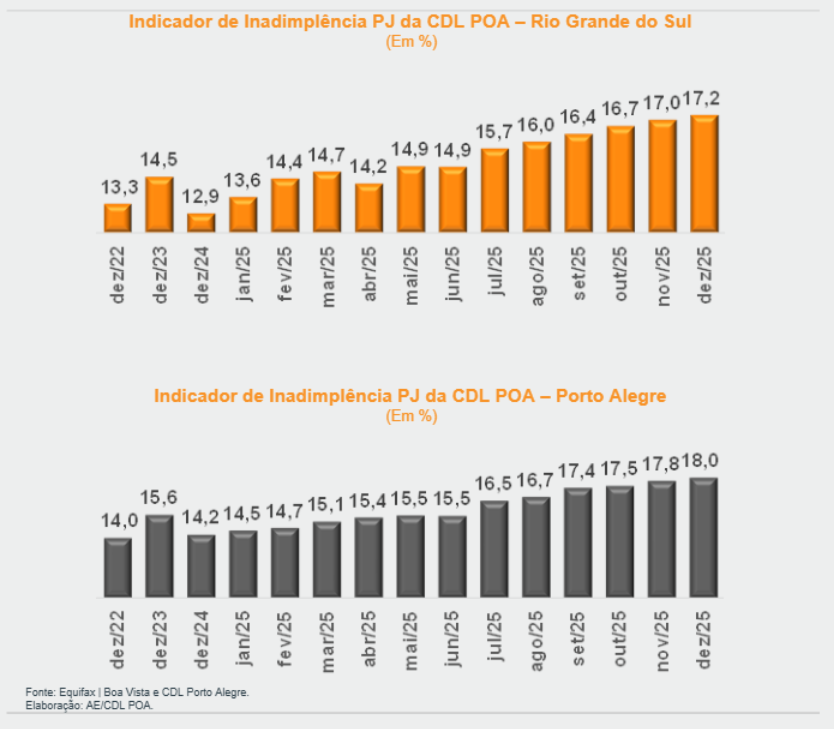 No segmento empreendedor, o panorama difere: a inadimplência das pessoas jurídicas renovou máximas históricas em dezembro. O percentual de CNPJs com restrições alcançou 17,22% no Rio Grande do Sul e 18,03% em Porto Alegre, marcando a sexta alta mensal consecutiva.